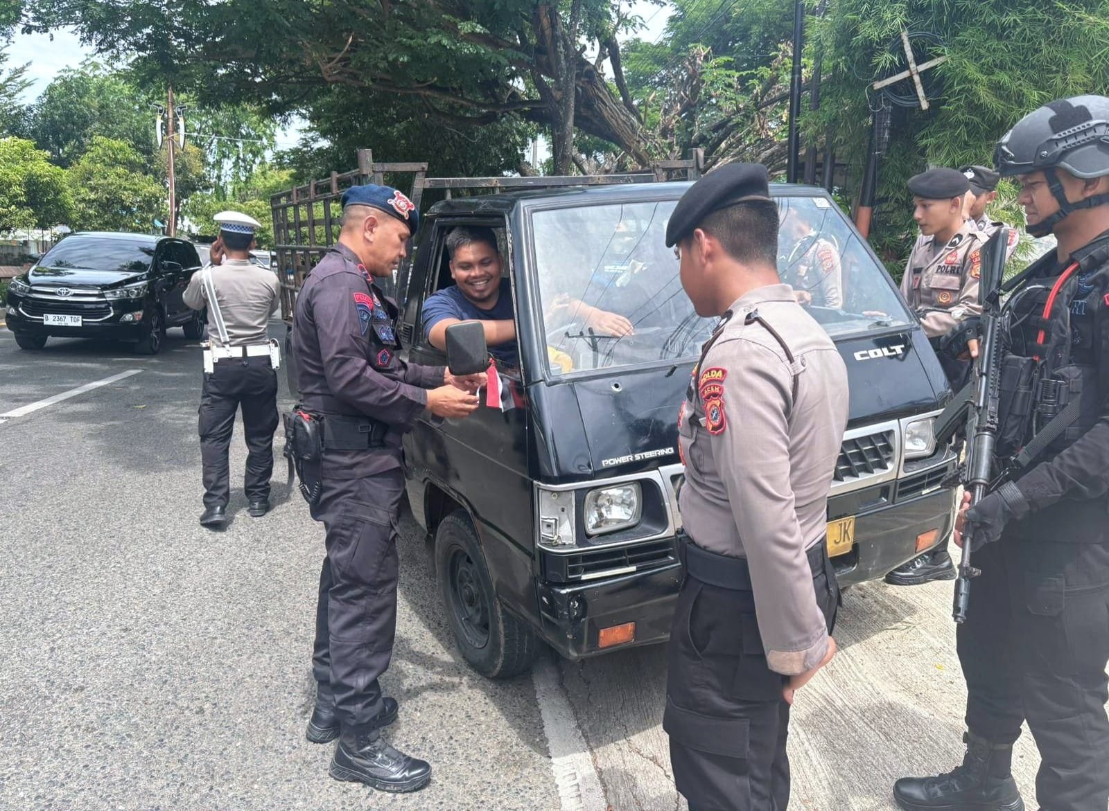 Petugas terlihat menyapa pengendara dengan ramah, memasang bendera di sepeda motor maupun mobil, dan mengingatkan warga pentingnya keselamatan berlalu lintas.