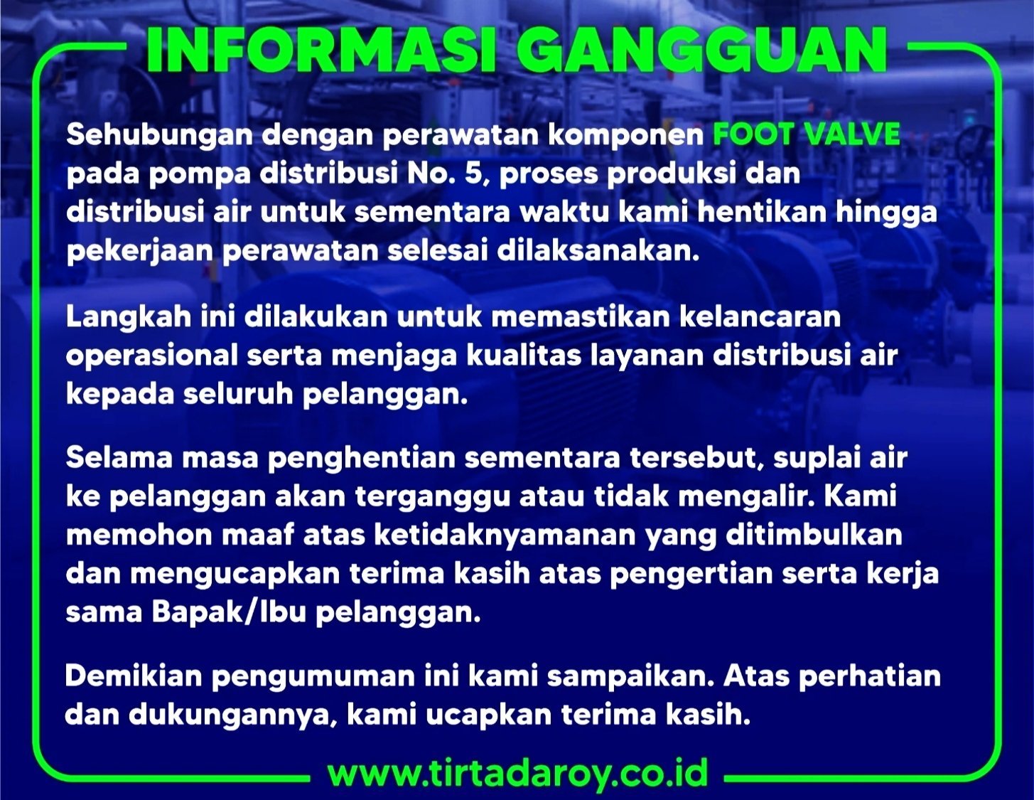 “Kami memohon maaf atas ketidaknyamanan yang ditimbulkan dan mengucapkan terima kasih atas pengertian serta kerja sama para pelanggan,” tulis manajemen Tirta Daroy dalam keterangannya.