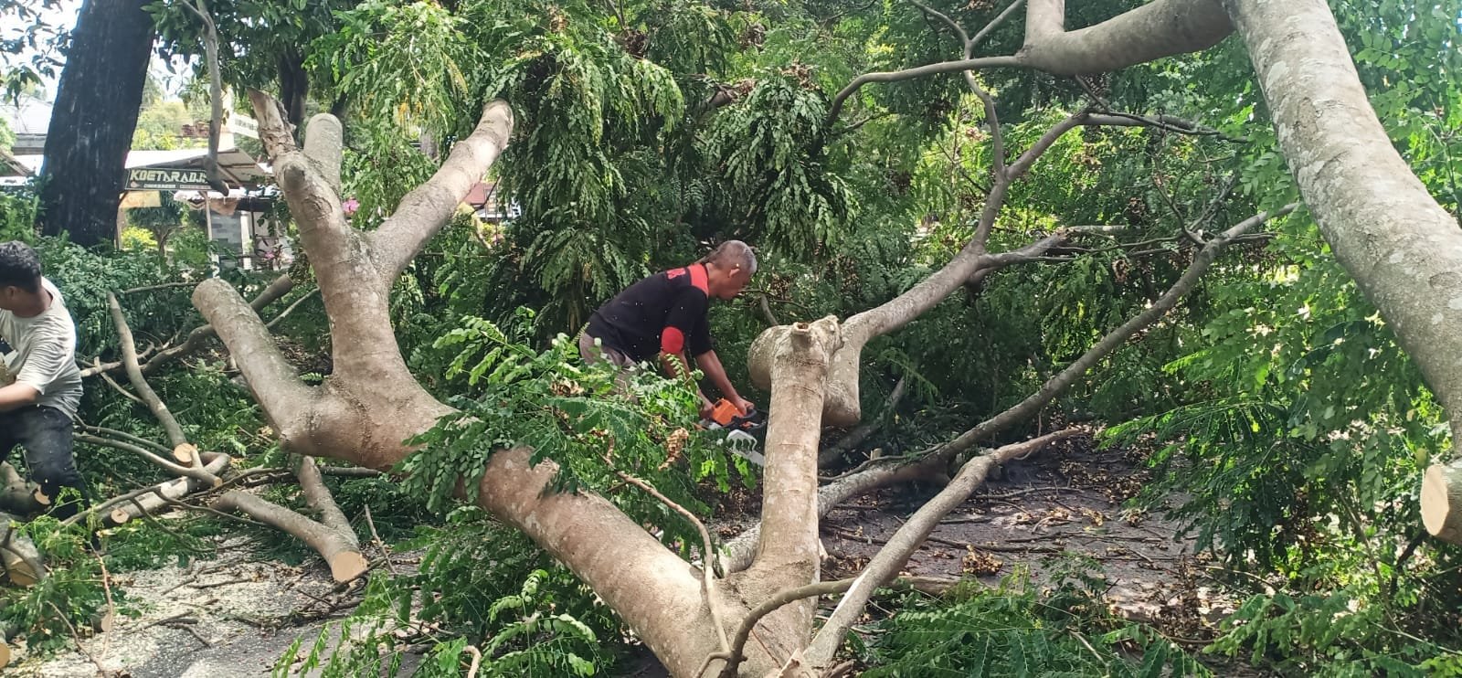 Dengan memanfaatkan mesin senso (gergaji mesin) yang tersedia di dalam kendaraan, proses pembersihan batang pohon dilakukan secara cepat di lokasi kejadian. Upaya tersebut turut dibantu warga sekitar yang sigap bergotong royong menyingkirkan potongan kayu dari badan jalan.