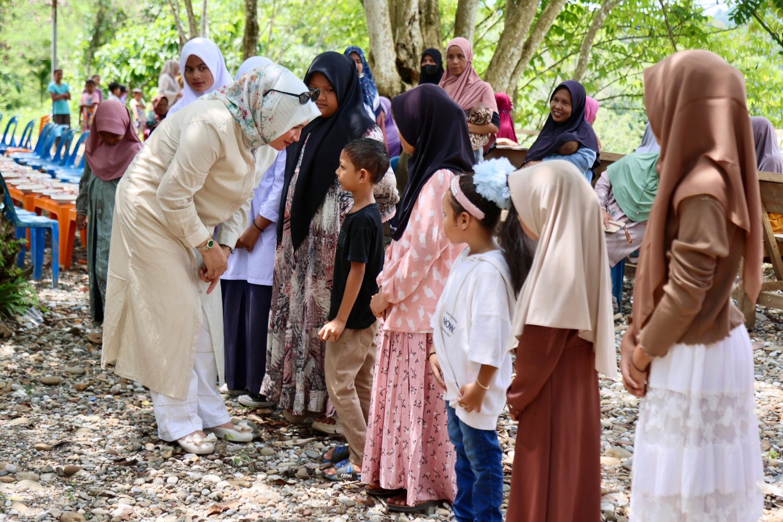 Puas bercengkerama dengan para bocah, Kak Na bergeser ke kerumunan kaum ibu yang sedari tadi sabar mengantri perhatian. Kaum emak pun menyambut antusias saat Kak Na datang menyapa.