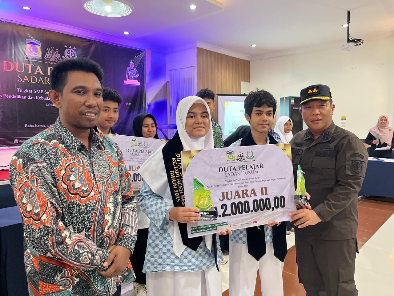 Berdasarkan penilaian dewan juri, berikut pemenang Duta Pelajar Sadar Hukum tingkat SMP se-Kabupaten Aceh Besar Tahun 2025: