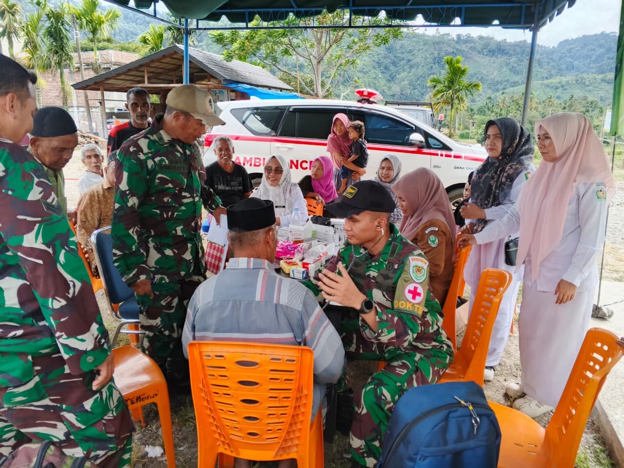 Tenaga medis TNI melayani warga satu per satu meski menghadapi keterbatasan fasilitas dan medan berat akibat akses terputus.