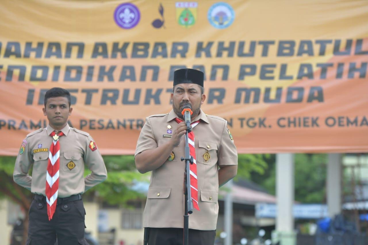 MITRABERITA.NET | Ketua Kwartir Cabang Pramuka Aceh Besar, Muhammad Iswanto, menjadi pembina upacara pembukaan kegiatan perkemahan akbar serta pendidikan dan pelatihan instruktur muda (PPIM) 2025, di Pesantren Modern Tgk. Chiek Oemar Diyan, Kamis 7/ Agustus 2025.