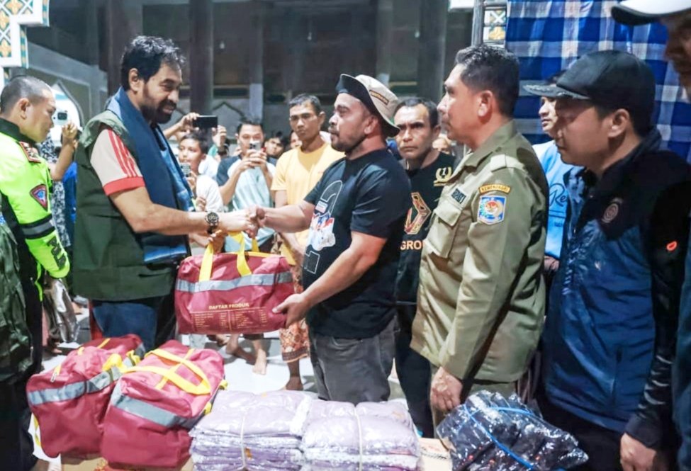 Mualem bersama rombongan melanjutkan peninjauan ke titik pengungsian di Masjid Meunasah Manyang, Meureudu. Ia menyerahkan bantuan tanggap darurat berupa kebutuhan pokok bagi para pengungsi.