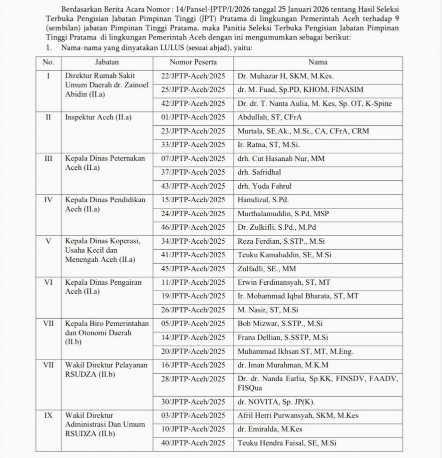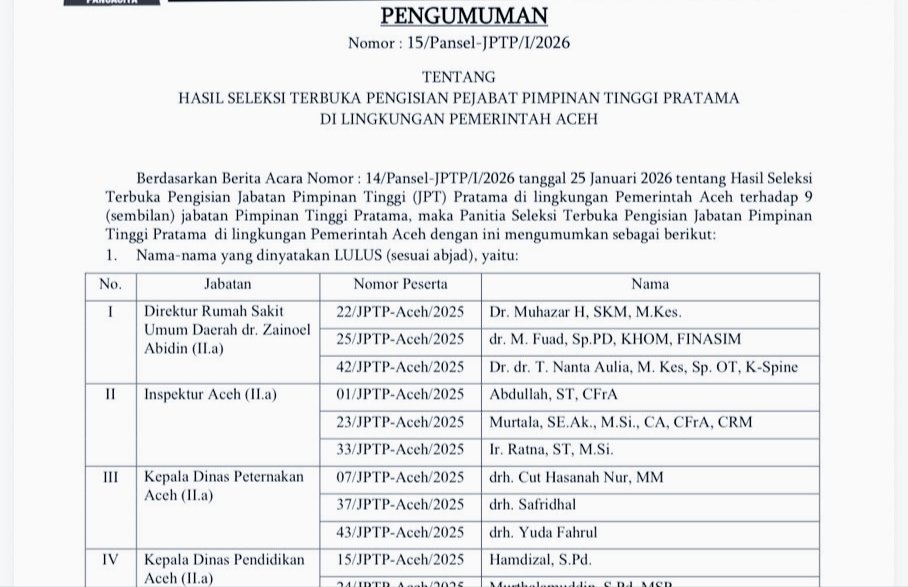 MITRABERITA.NET | Panitia Seleksi (Pansel) Jabatan Pimpinan Tinggi (JPT) Pratama Pemerintah Aceh secara resmi mengumumkan hasil seleksi terbuka pengisian jabatan strategis di lingkungan Pemerintah Aceh. Pengumuman itu disampaikan pada Ahad 25 Januari 2026, setelah seluruh tahapan seleksi rampung dilaksanakan.