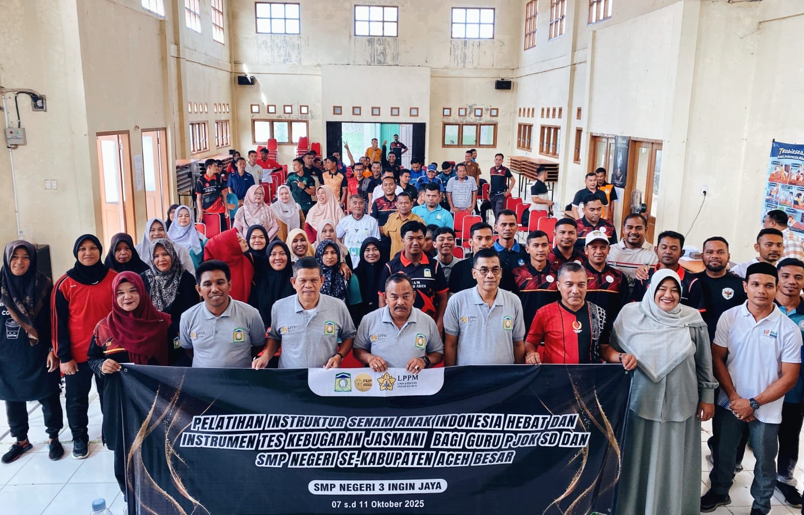 Langkah tersebut diwujudkan melalui Pelatihan Instruktur Senam Anak Indonesia Hebat dan Instrumen Tes Kebugaran Jasmani bagi Guru PJOK (Pendidikan Jasmani, Olahraga, dan Kesehatan) SD dan SMP Negeri se-Kabupaten Aceh Besar, yang resmi dibuka di SMP Negeri 3 Ingin Jaya, Selasa 7 Oktober 2025.