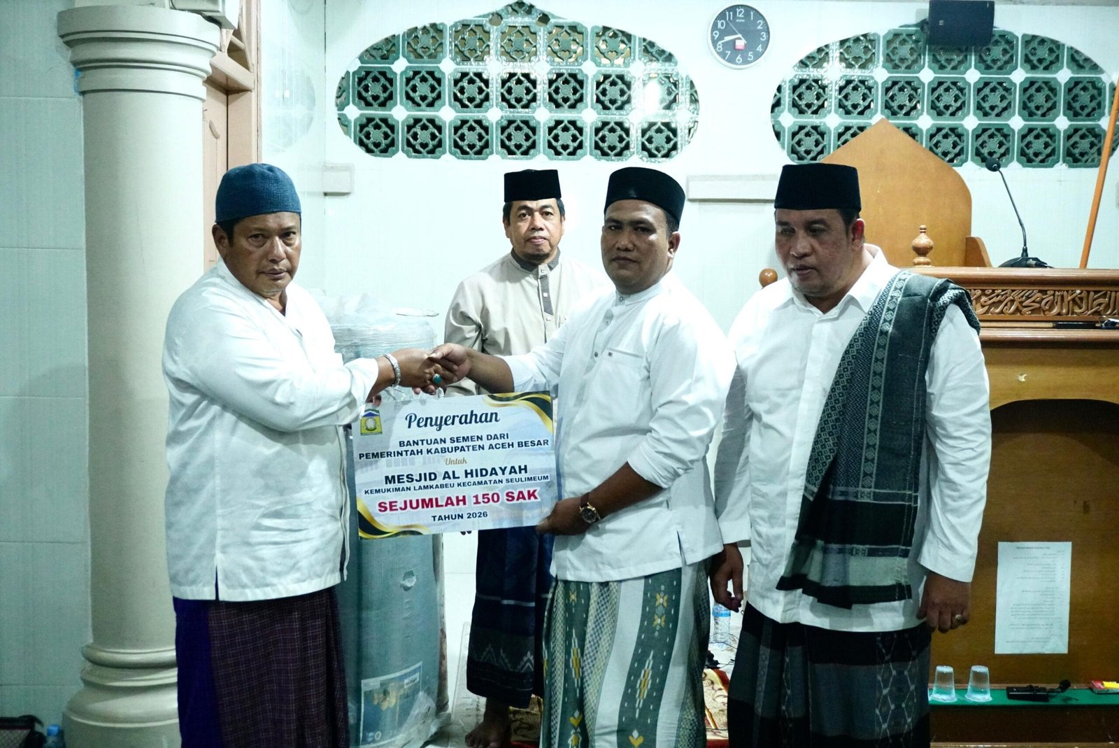 Pemkab Aceh Besar Serahkan 150 Sak Semen dan Sajadah untuk Masjid Al Hidayah Lamkabeu