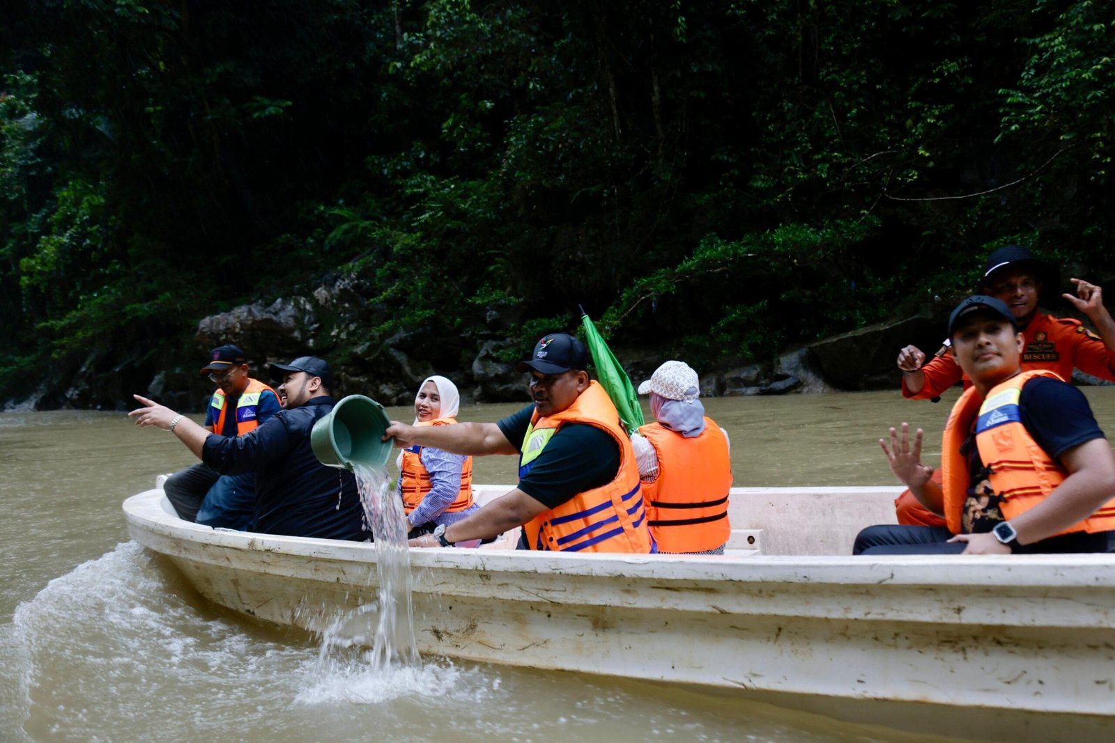 Belum setengah perjalanan, boat yang ditumpang Pj Gubernur Safrizal menepi. Mesin Yamaha di boat mati tiba-tiba. Tali kopling mesin tua itu putus.