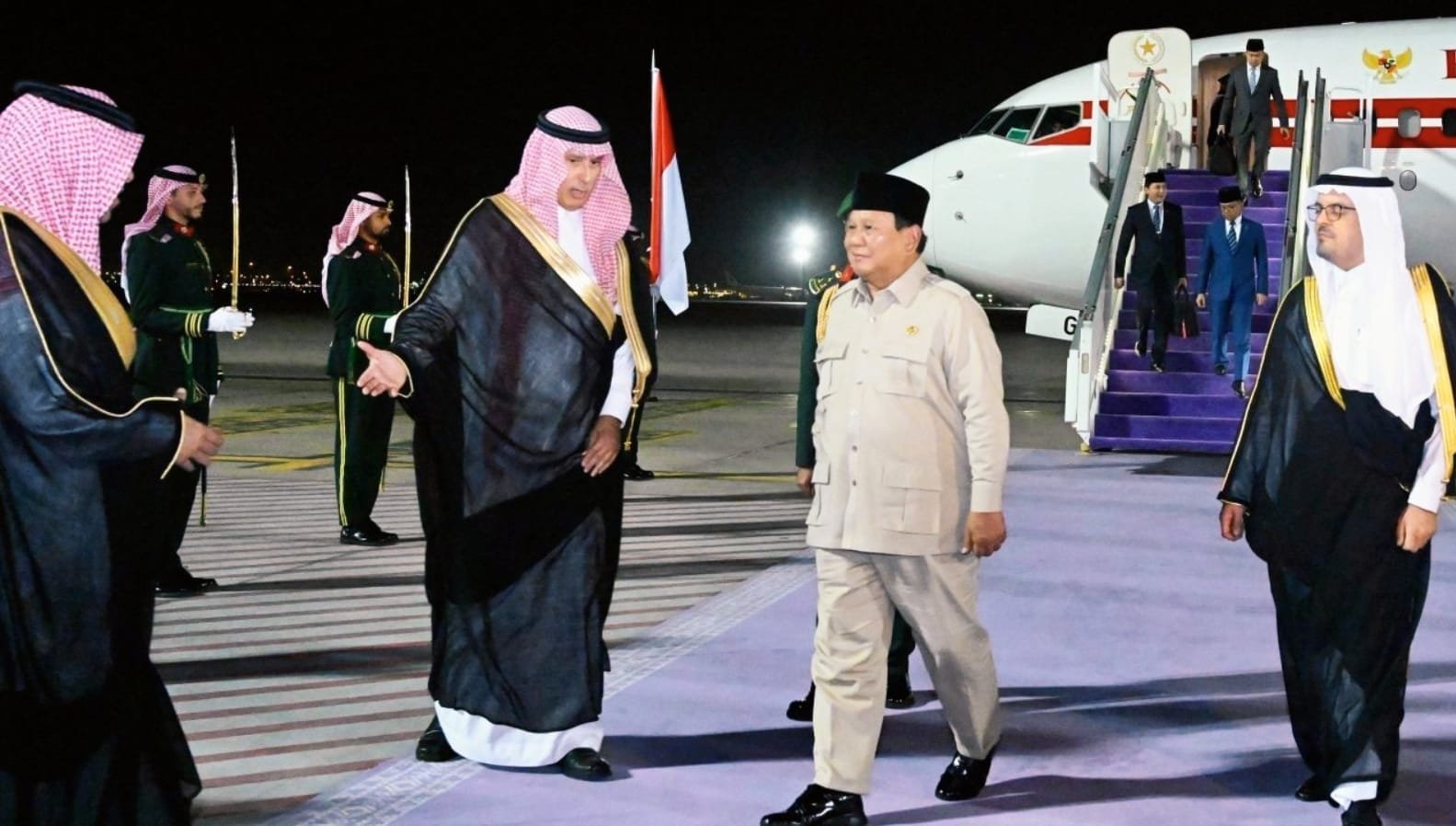 Setibanya di bandara, Presiden Prabowo disambut secara resmi oleh delegasi Kerajaan Arab Saudi dalam sebuah upacara kehormatan.