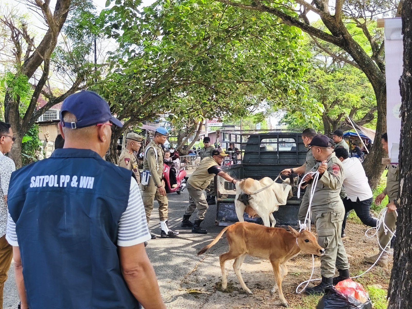 Petugas Satpol PP dan WH Aceh Besar mengamankan ternak sapi yang berkeliaran di ruas Jalan Rel Kereta Api Lama, kawasan Pagar Air, Kecamatan Ingin Jaya, Kabupaten Aceh Besar, Jumat (24/4/2026). Foto: MC Aceh Besar