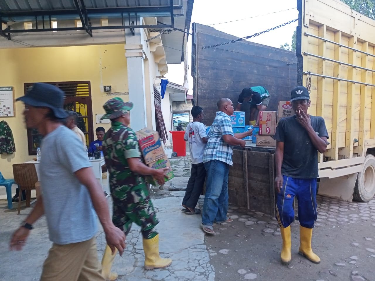 Di sektor bantuan sosial, Babinsa Koramil 03/Seruway mendampingi penyaluran bantuan sembako bagi warga terdampak banjir di Desa Kampung Baru, Kecamatan Seruway.