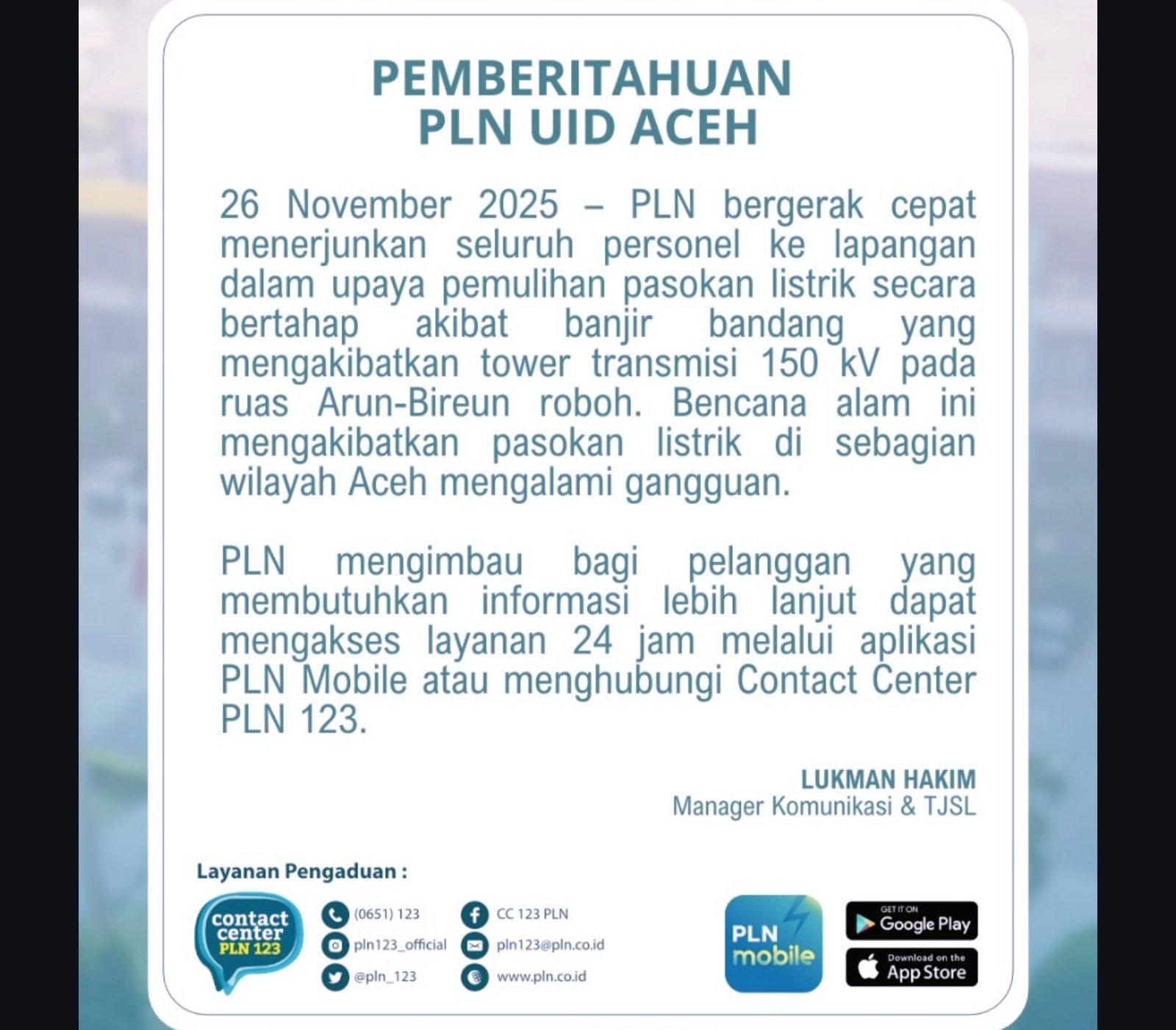 Peristiwa pada Rabu 26 November 2025, itu menyebabkan tower transmisi 150 kV di ruas Arun–Bireuen roboh, sehingga memicu gangguan pasokan listrik di beberapa kabupaten/kota.