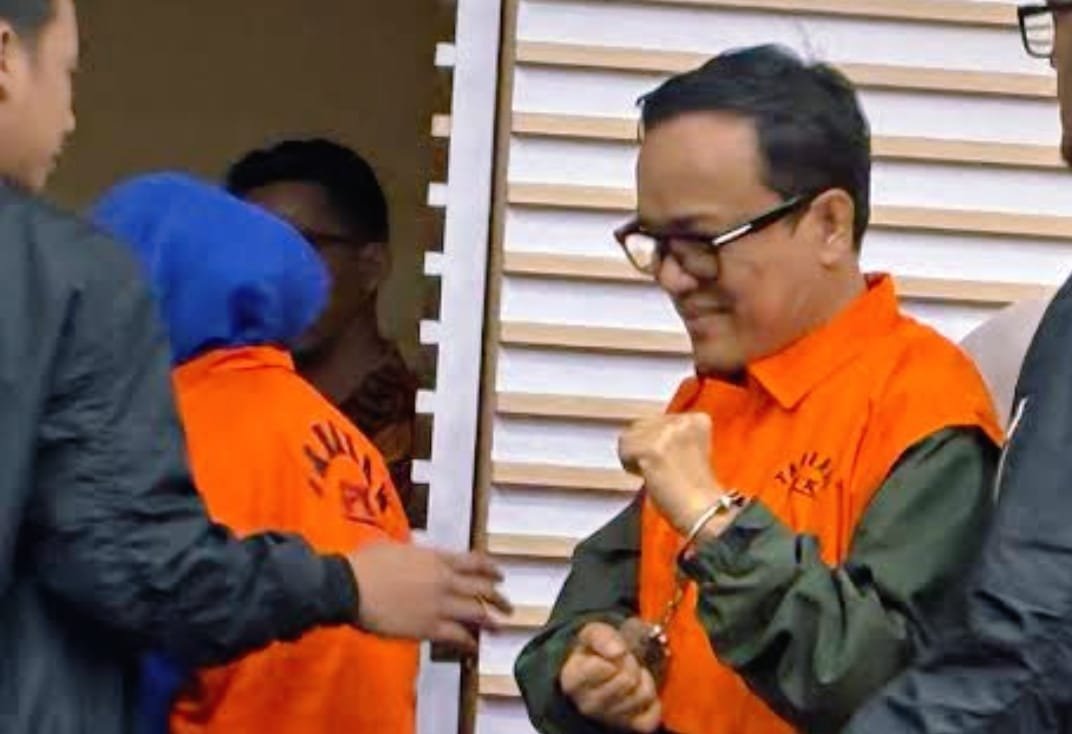 Tangannya terborgol saat digiring penyidik menuju ruang konferensi pers untuk menyampaikan konstruksi perkara. Pemandangan itu sekaligus menegaskan wakil menteri kabinet Prabowo Subianto itu kini berstatus tersangka.