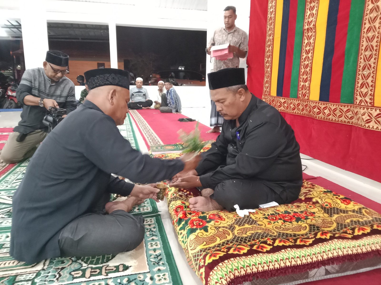 Keuchik Gampong Leu-Ue Yusri VE ST saat prosesi penyambutan adat (peusijuk) di Meunasah Gampong Leu-Ue, pada Senin (24/11/2025). Foto: MC Aceh Besar